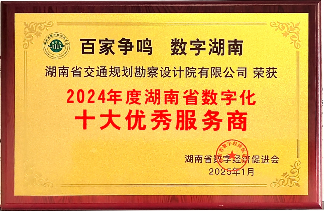 1月4日,“2025長(zhǎng)江數(shù)字經(jīng)濟(jì)發(fā)展大會(huì)暨第五屆湖南省數(shù)字經(jīng)濟(jì)論壇”在湖南長(zhǎng)沙舉行,湖南省工業(yè)和信息化廳黨組成員、總經(jīng)濟(jì)師熊琛出席大會(huì)并講話。湖南省交通規(guī)劃勘察設(shè)計(jì)院有限公司榮膺“2024年度湖南省數(shù)字化十大優(yōu)秀服務(wù)商”,也是省屬國(guó)企中唯一一家入選企業(yè),彰顯了其在數(shù)字...