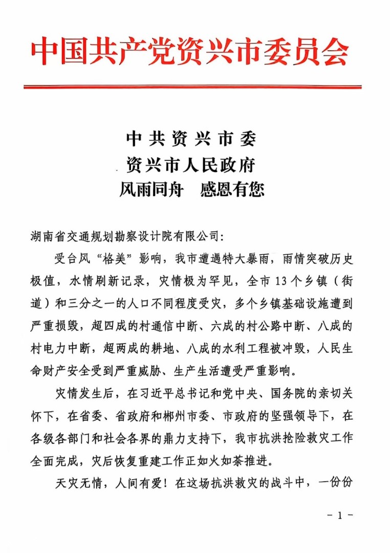 近日,中共資興市委、資興市人民政府發(fā)來(lái)感謝信,信中高度評(píng)價(jià)了湖南省交通規(guī)劃勘察設(shè)計(jì)院有限公司在馳援資興搶險(xiǎn)救災(zāi)及災(zāi)后恢復(fù)重建工作中展現(xiàn)的擔(dān)當(dāng)精神和技術(shù)水平,對(duì)公司作出的積極貢獻(xiàn)表達(dá)了誠(chéng)摯的感謝。信中指出,資興市此次遭遇災(zāi)情極為罕見(jiàn),多地基礎(chǔ)設(shè)施遭到嚴(yán)重?fù)p毀、大范...
